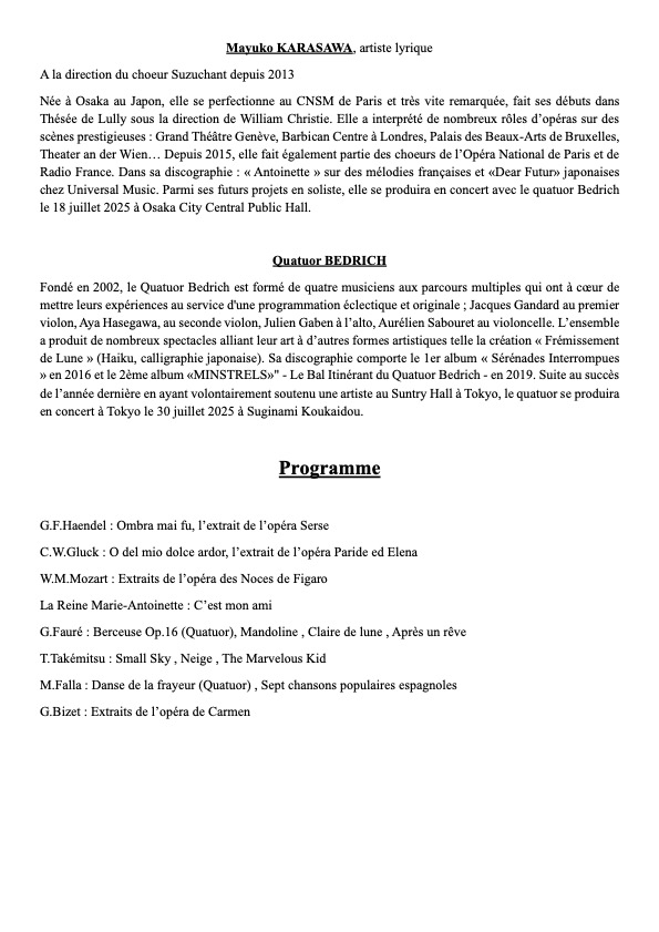 Le collaboration qui existe depuis plusieurs années entre la mezzo-soprano Mayuko Karasawa et le quatuor Betrich nous permet de vous proposer ce concert lyrique en version quatuor à corde. Les arrangements du premier violon Jacques Gandar comprennent des mélodies françaises inspirées des poèmes des Fêtes Galantes de Verlaine, de chansons espagnoles, ainsi que de célèbres airs d’opéra et de pièces instrumentales.Ce concert sera également l’occasion de découvrir la romance « C’est mon ami », composée par la reine Marie-Antoinette elle-même, et que Mayuko Karasawa a recherchée à la Bibliothèque Nationale de France et introduite pour la première fois au Japon en 2003, dans un enregistrement mondial inédit pour la Label Decca chez Universal Music.